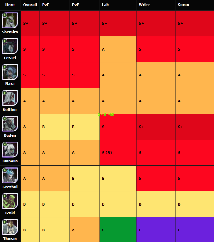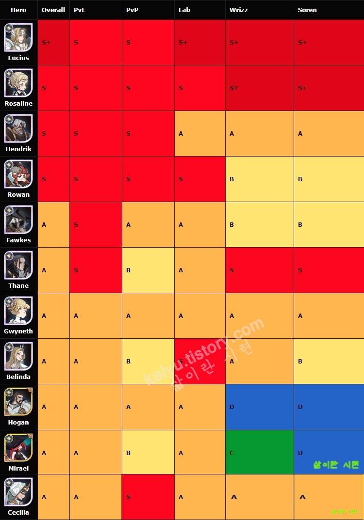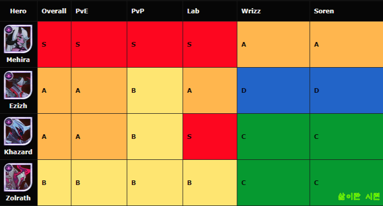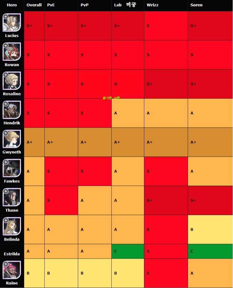 초반 단계의 등급표는 그냥 생략하겠습니다. 하루 이틀 하면 60lv단계는 넘어간답니다. 이계영웅 또한 후반부부터 쓰이기때문에 중반부에는 생략했어요. 최신 영웅인 사우러스는 종반부 등급표에 반영했습니다.