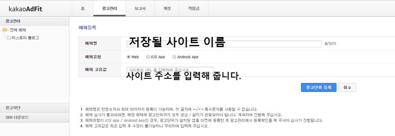 이 곳에서 광고단위명을 입력후