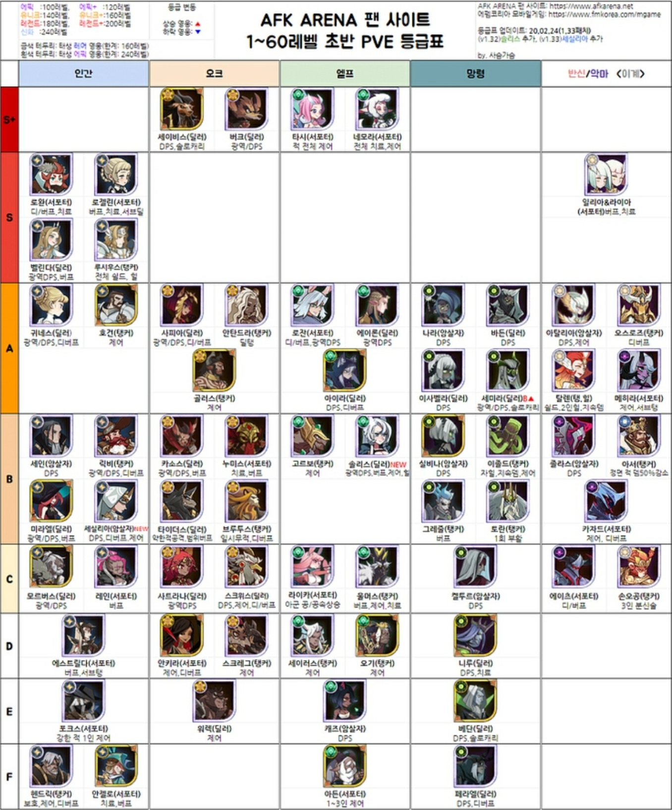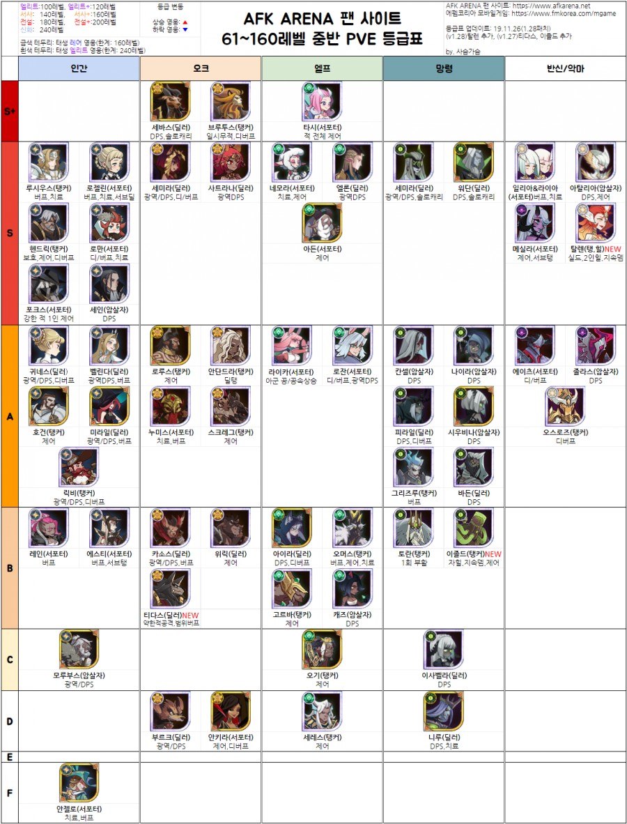 유's AFK 아레나 등급표 종족별 영웅 - 최신 티어표 1.36ver
