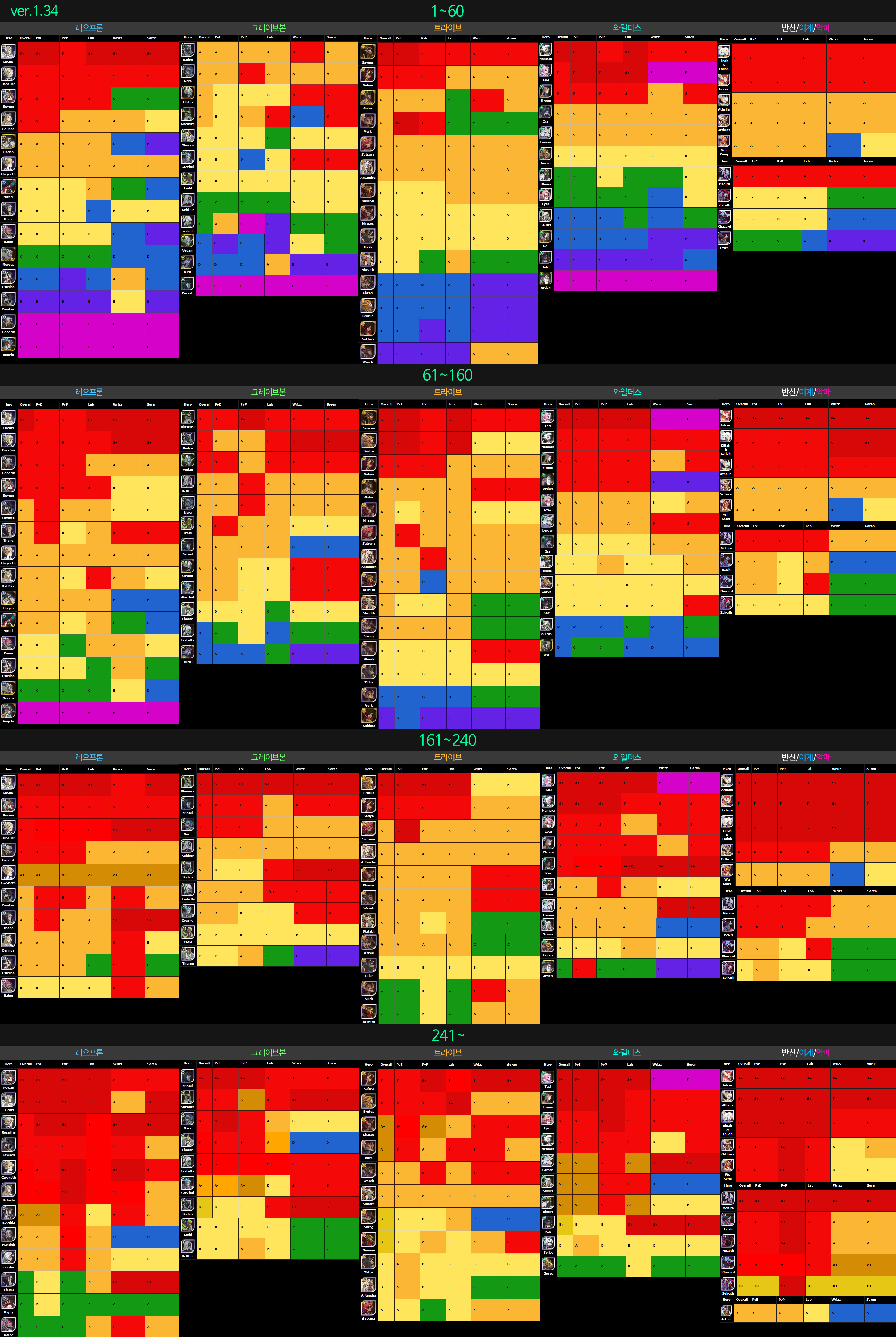 최신 등급표 종족별 정리 / 티어 리스트 오스카 우쿄 반영 본론으로 들어가자면 AFK 아레나 등급표는 총 4단계로 나뉩니다. 초반 1레벨~60레벨 중반 61레벨~160레벨 후반 161레벨~240레벨 종반부 240+레벨 (전용..
