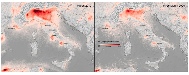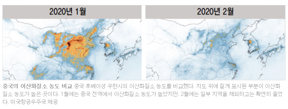 미국항공우주국(NASA)과 유럽우주국(ESA)이 수집한 위성 데이터 분석 결과 올해 2월 한 달간 중국에서 화석 연료 소비로 발생하는 대기 중 이산화질소가 급격히 감소한 것으로 나타났다. 핀란드 헬싱키 소재 에너지및청정대기연구센터가 위성 데이터를 토대로 분석한 결과에 따르면 중국의 산업 활동은 코로나19 사태로 최대 40% 줄었다. 올해 2월 중국 내 석탄 소비는 최근 4년간 최저치를 기록했다. 석유 소비도 3분의 1 이상 줄었다. 이 기간에 중국의 탄소 배출량은 25% 이상 줄어든 것으로 나타났다.