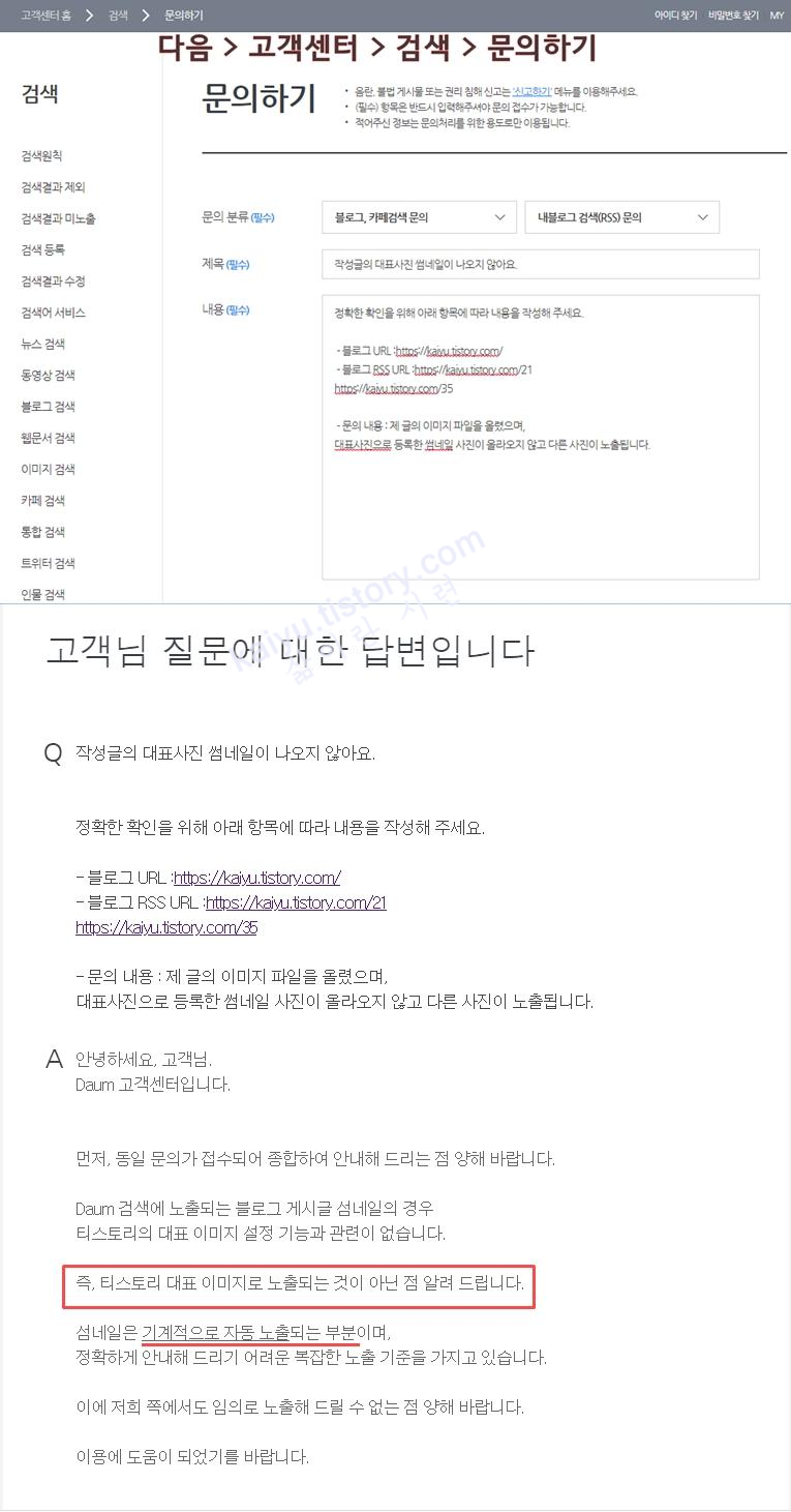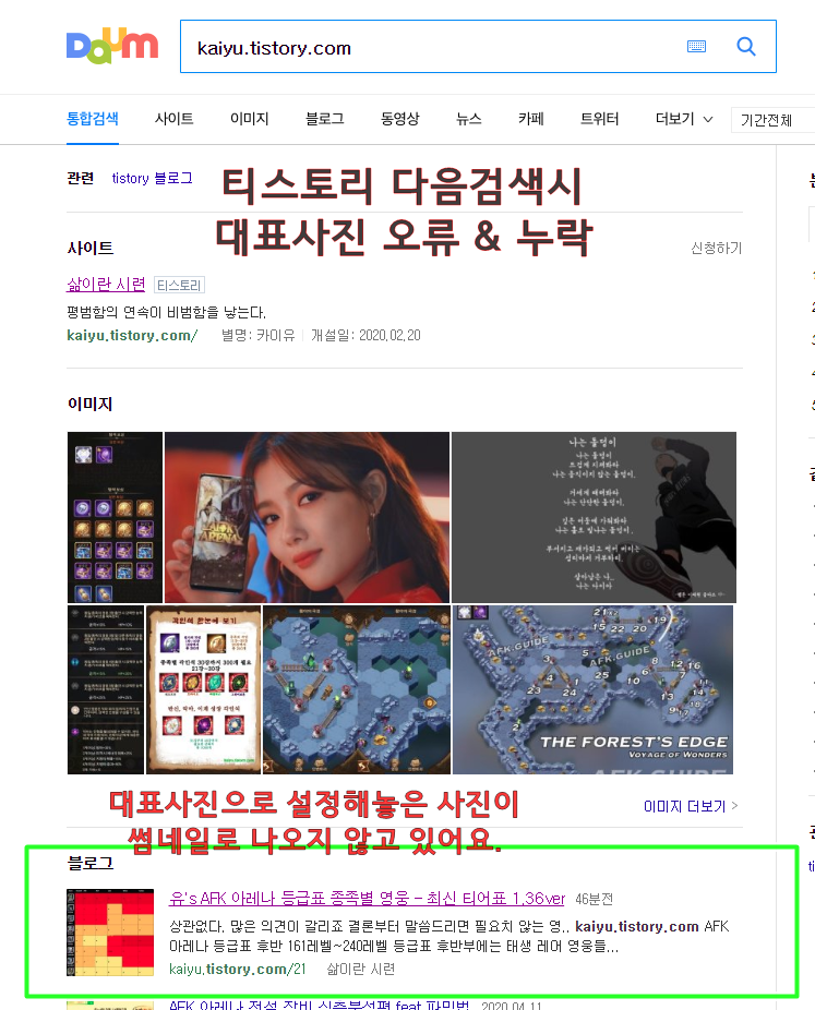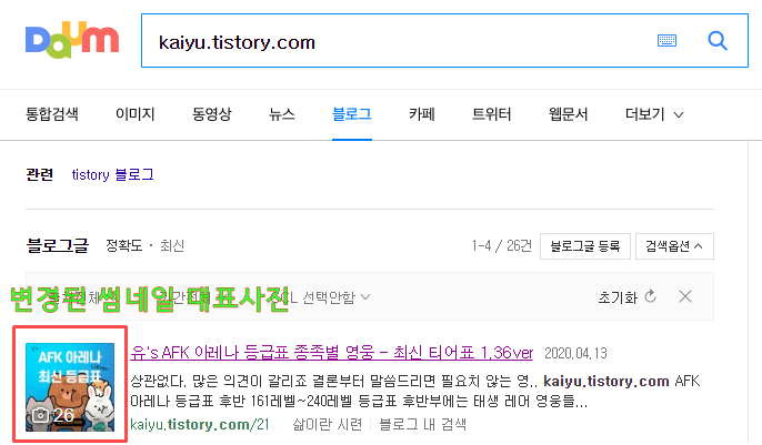 티스토리 내에서 자신이 봤을 때는 자신이 지정한 대표 사진으로 설정되어있지만, 다음 검색을 통해 보게 되면 전혀 다른 사진이 올라와 있는 경우가 있습니다. 검색을 통해 확인을 한 번씩 해주세요.