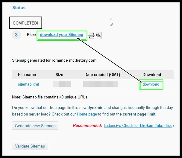 위 이미지처럼 생성이 완료되면 Completed 가 뜨고 view sitemap details를 누르시면 생성된 사이트맵파일을 다운 받으실 수 있어요.