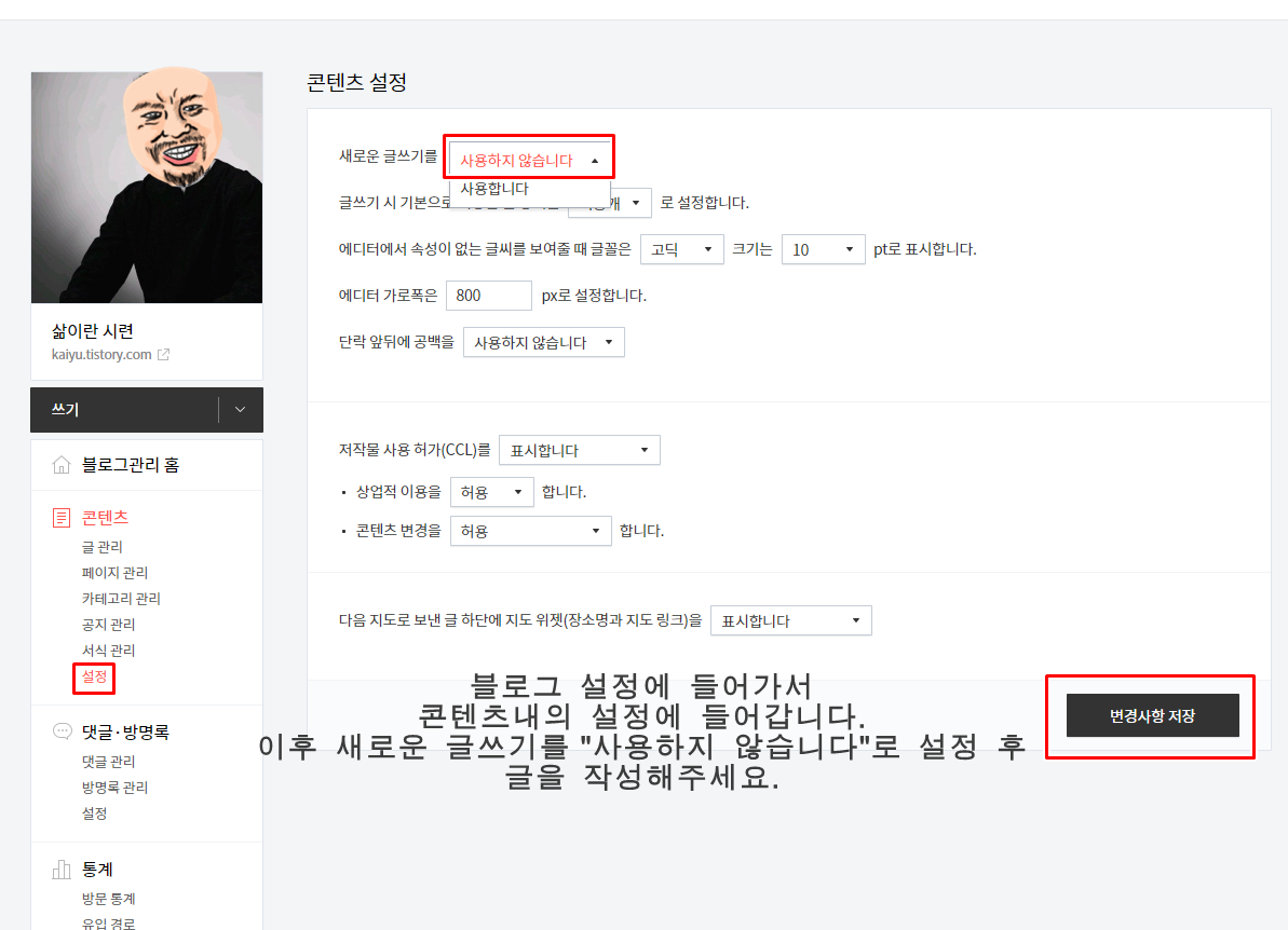 가장 먼저 해야할 일은 티스토리 블로그에서 글 작성시 새로운 글쓰기를 이용하시는 분들은 반드시 새로운 글쓰기를 '사용하지 않습니다'로 변경해 주셔야 합니다.