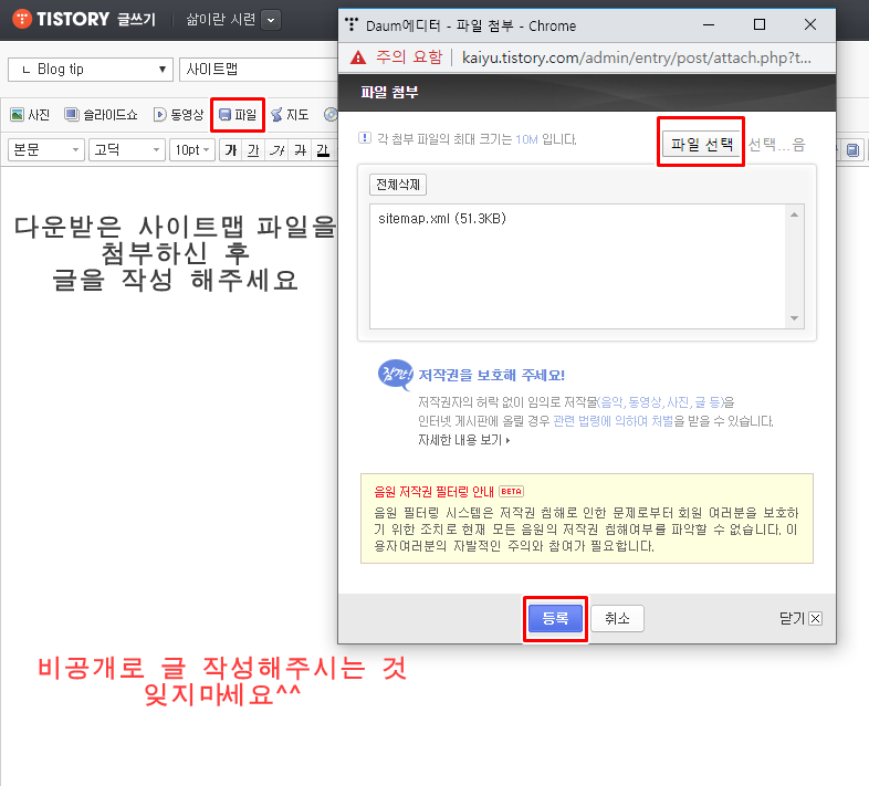 이전 버전 글쓰기로 사이트맵 파일을 올려줍니다.