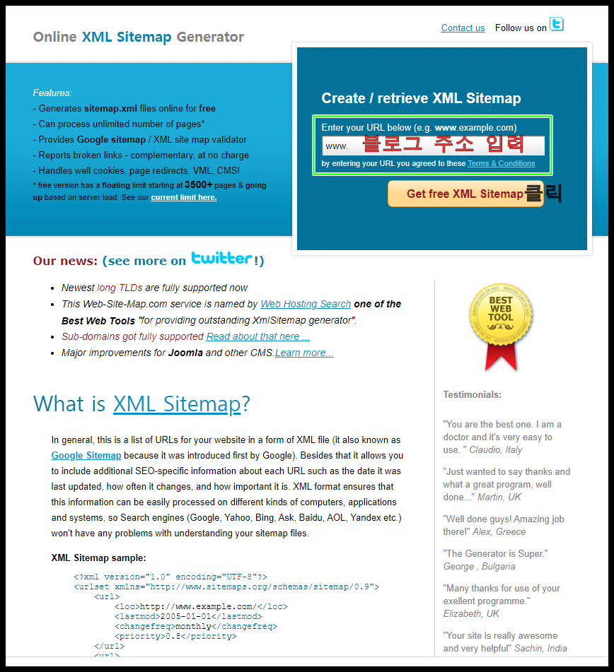 www. 뒤에 https:// 를 제외한 본인의 블로그 주소를 입력하신 후 바로 밑의 Get free XML Sitemap을 클릭해주세요.