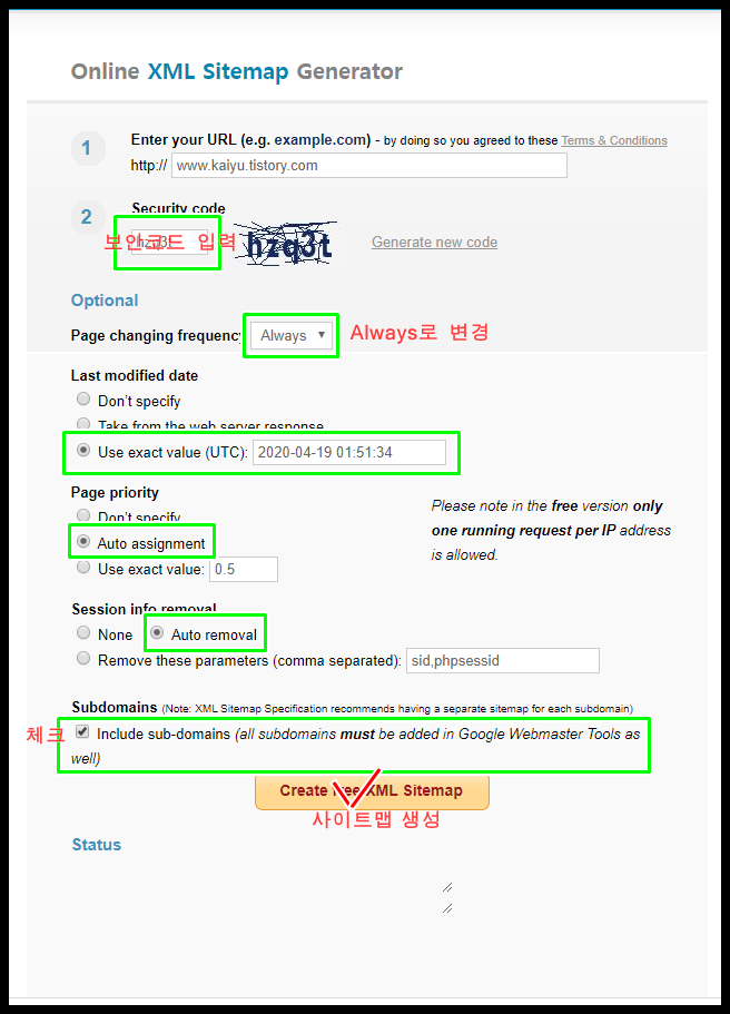 위 이미지와 같이 똑같이 설정해주시고 사이트맵 생성버튼을 누루시면 밑에 Status 창에 사이트맵이 생성된답니다.