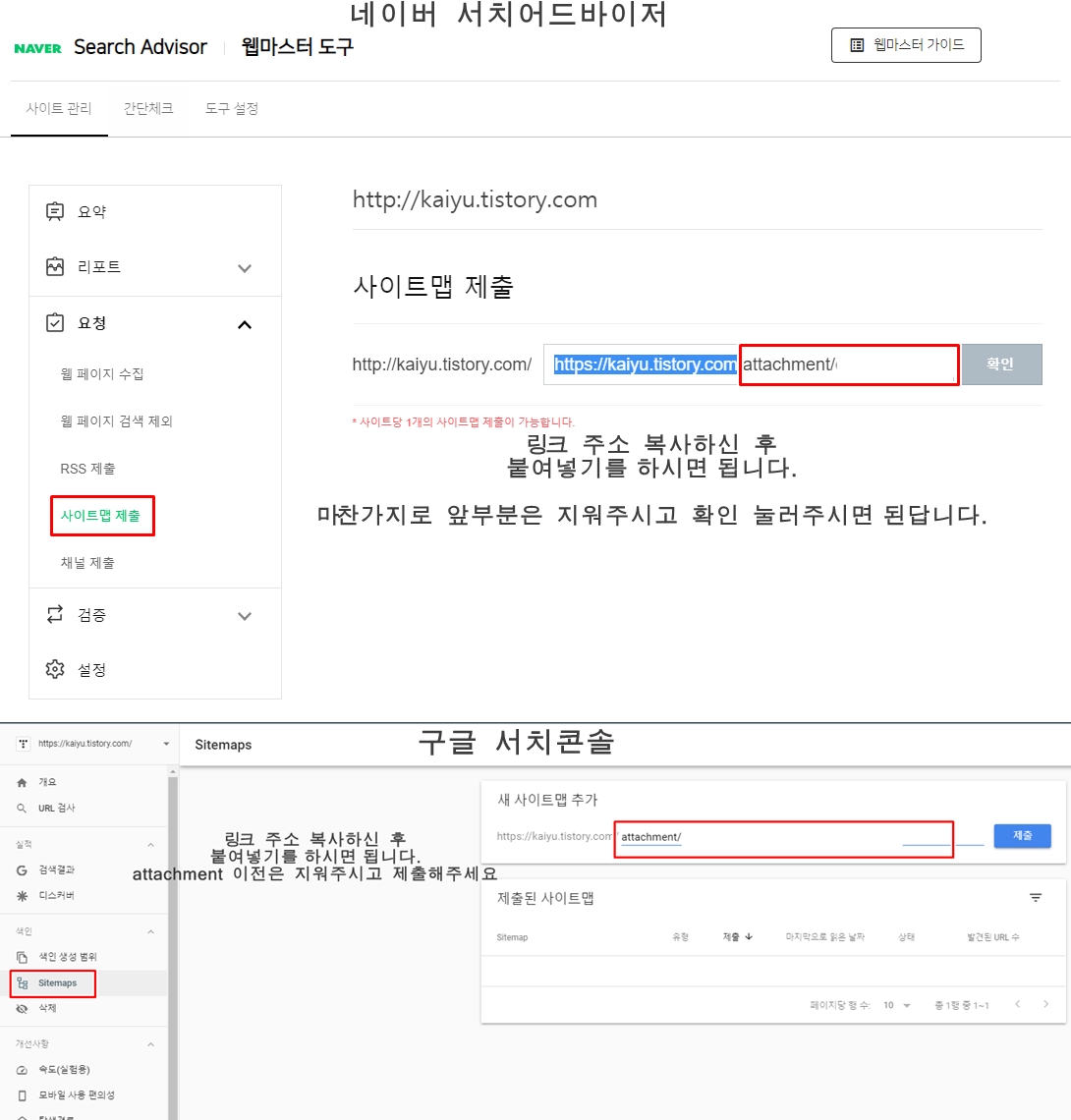 이제 복사된 링크 주소를 웹마스터 도구인 네이버 서치어드바이저, 구글 서치콘솔 사이트맵 제출에서 제출해주면 된답니다.