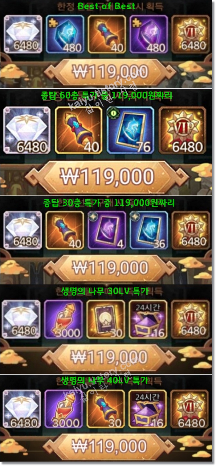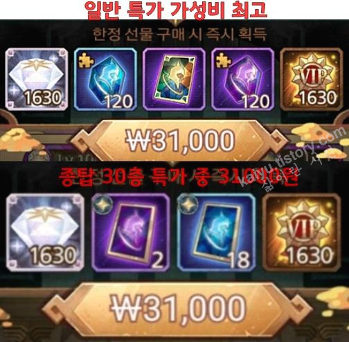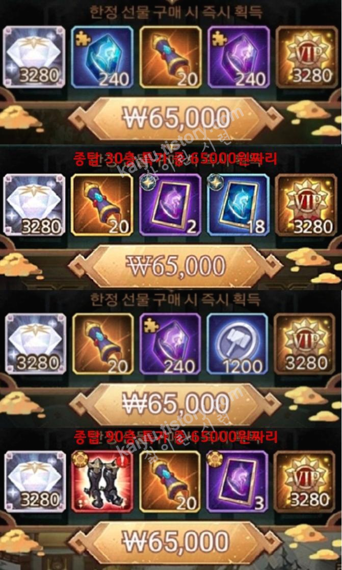 특히, 종족의 탑 30층과 60층 특가는 재료수급에 있어서 무조건 구매해주는 편이 좋답니다.
