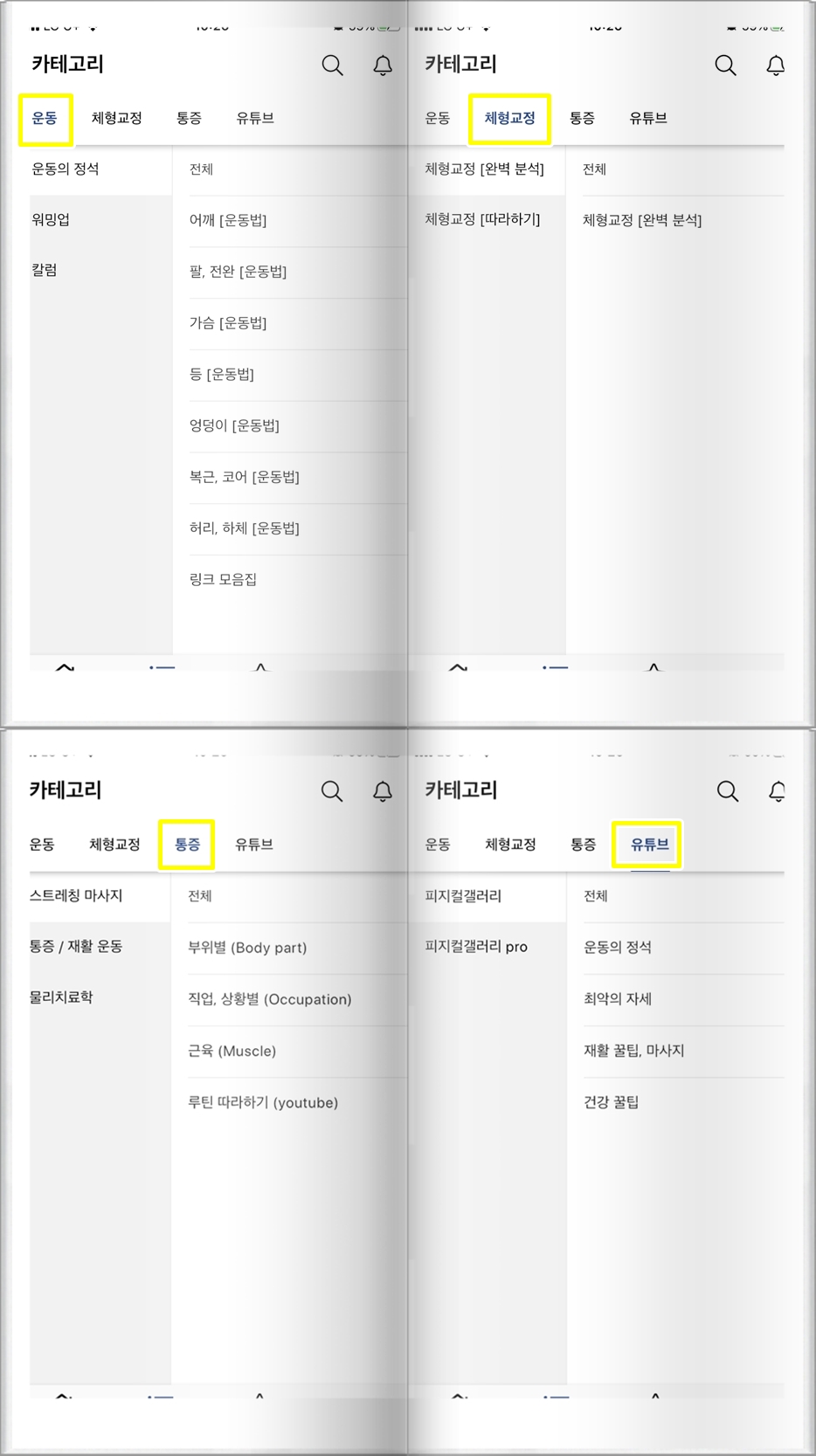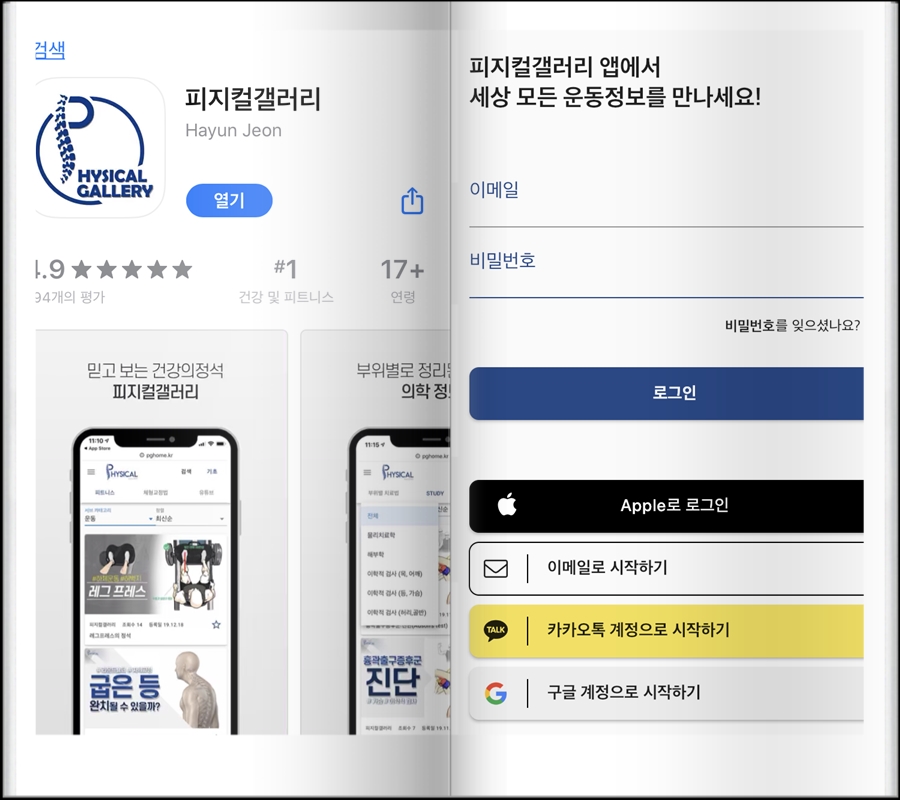피지컬 갤러리의 어플에서는 운동법, 체형교정, 통증에 관해서 더욱 찾기 쉽고 상세히 설명되어 있어서 운동을 하시는 분에게 많은 도움이 될 거 같습니다.